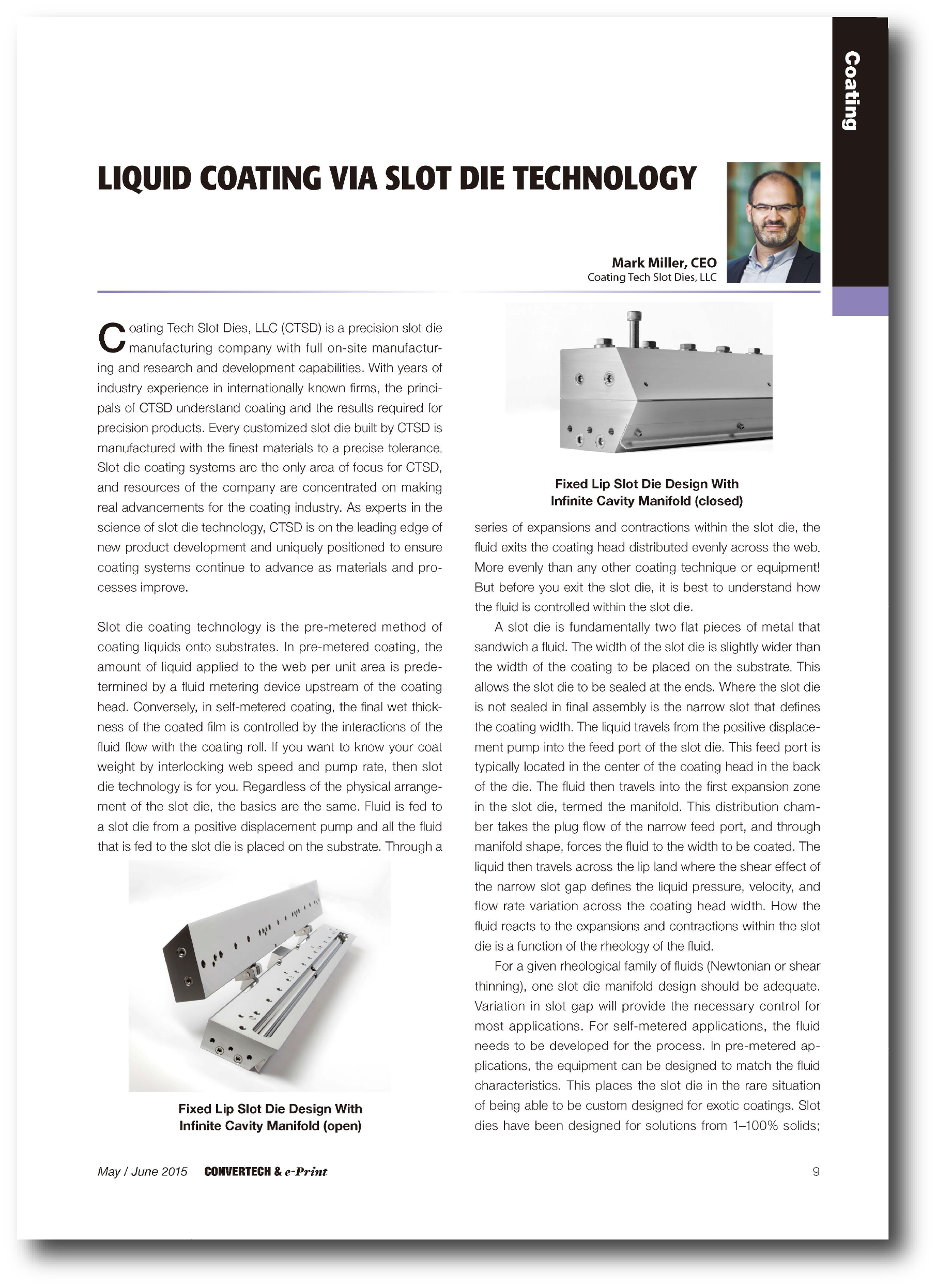 Click here to download a copy of the Convertech Article reprint from May/June 2015 authored by Mark Miller of Coating Tech Slot Dies.